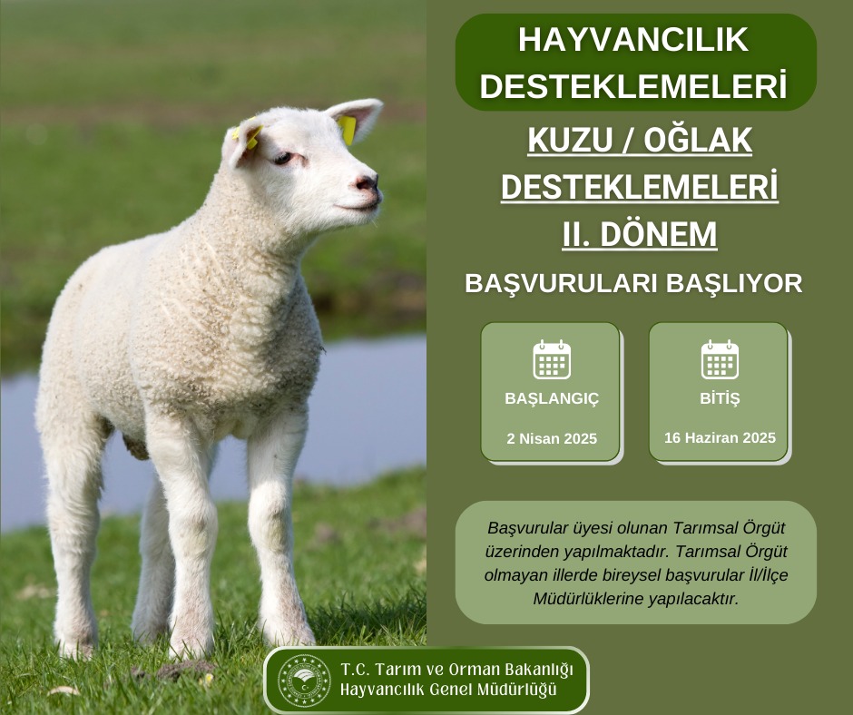 2024 yılı 1. Dönemde başvuru yapamayan yetiştiriciler için  2. dönem Büyükbaş Hayvancılık (buzağı/malak) ve Küçükbaş Hayvancılık (Kuzu/Oğlak) Destekleme başvuruları 2 Nisan'da başlayacak olup, 16 Haziran 2025 Pazartesi günü sona erecektir.​
